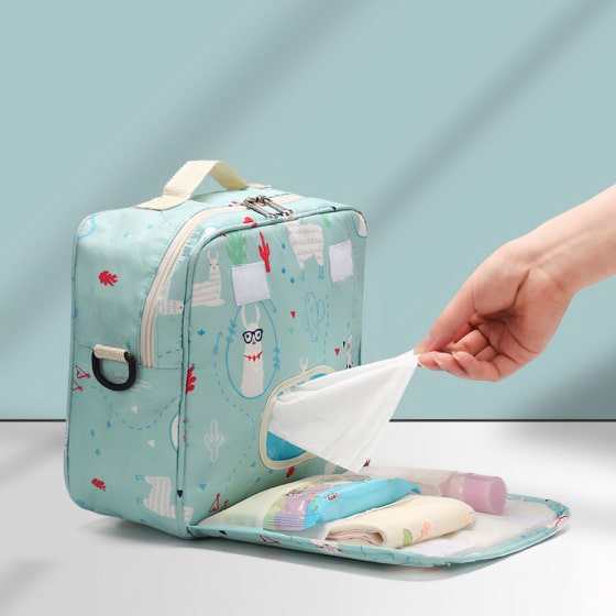 A great large capacity travel bag with multiple pockets for baby accessories and essentials. Comes in green color with many colorful images. Waterproof to keep your baby accessories safe and dry.
